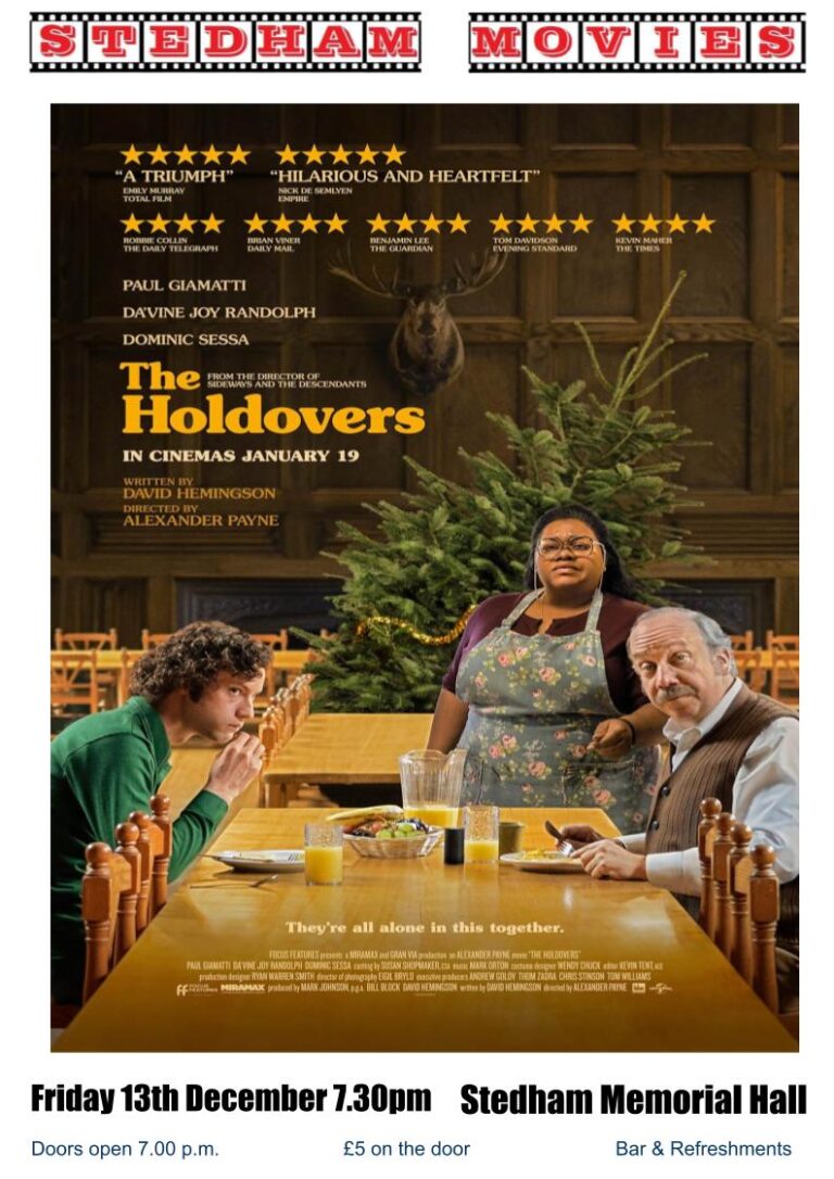 The Holdovers showing Friday 13th December. Starting 7.30 pm. Doors open 7pm. Bar & refreshments available. Entrance £5 on the door. A curmudgeonly instructor at