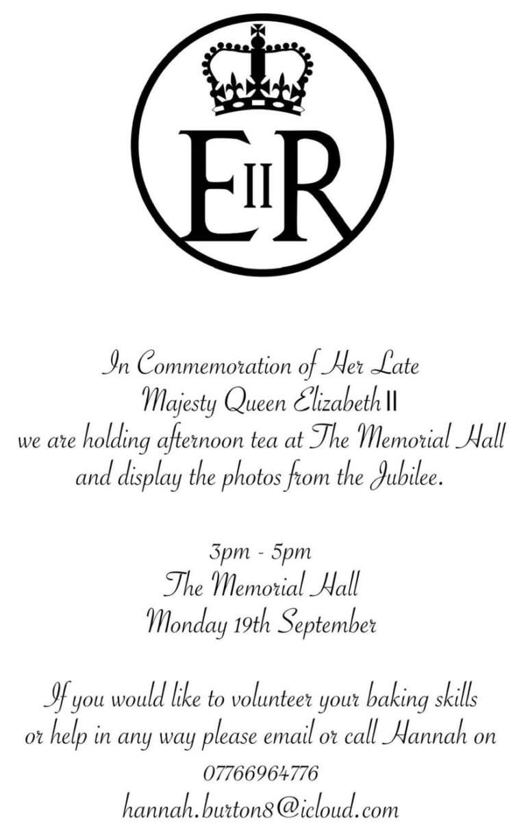 In memory of our late queen we are having a get together on Monday 19th, 3pm for afternoon tea and to hang the photos from